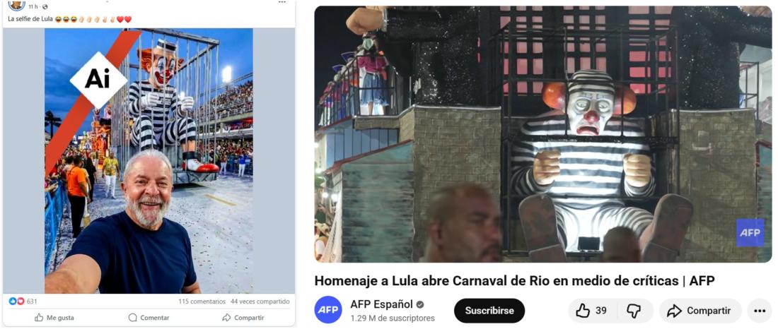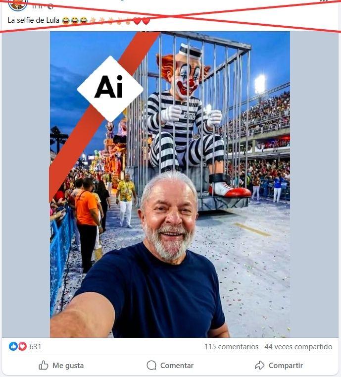 El presidente brasileño, Luiz Inácio Lula da Silva, fue homenajeado el 15 de febrero de 2026 en la apertura del Carnaval de Rio de Janeiro, evento al que asistió. Desde entonces, circula en redes sociales una supuesta selfi del mandatario junto a una carroza con una representación del “payaso Bozo” encarcelado y con una tobillera electrónica, que hace alusión al expresidente Jair Bolsonaro (2019-2022) para sus detractores. Sin embargo, la pieza, que fue compartida más de 2.000 veces, fue creada con inteligencia artificial (IA).