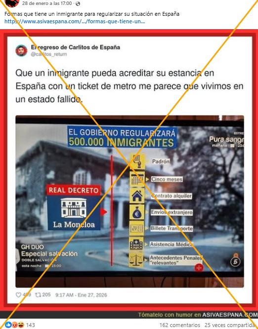 “El Gobierno va a regularizar a 500.000 inmigrantes si demuestran, con un simple recibo, que están en España desde hace sólo cinco meses. Y lo hará sin pasar por el Congreso. Es una exigencia de Podemos que se impondrá por decretazo. Así funciona ahora España”, recoge un mensaje en X.