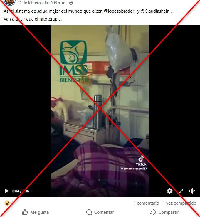 “Así el sistema de salud mejor del mundo que dicen @lopezobrador_ y @Claudiashein ... Van a decir que el ratoterapia”, dice una de las publicaciones que difunden el video en Facebook, Instagram, X y TikTok.