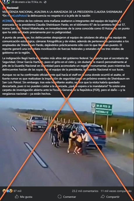 “El colmo de los colmos; esta mañana asaltaron a integrantes del equipo de logística y avanzada de la presidenta Claudia Sheinbaum Pardo, en el kilómetro 67 de la carretera federal 57, tramo San Luis Potosí-Matehuala, en inmediaciones de la zona conocida como El Huizache, un punto que ha sido señalado previamente por su peligrosidad”, afirma una publicación en Facebook.