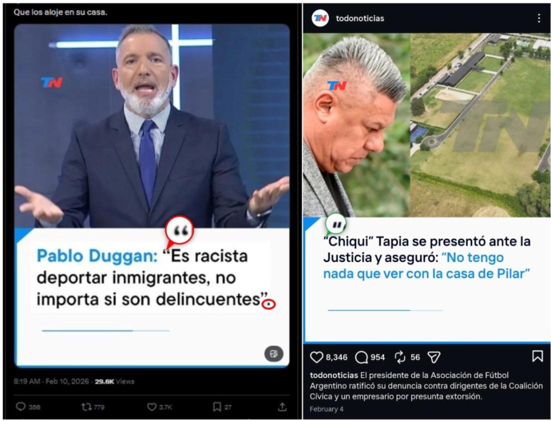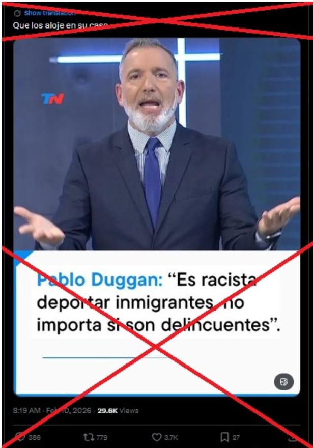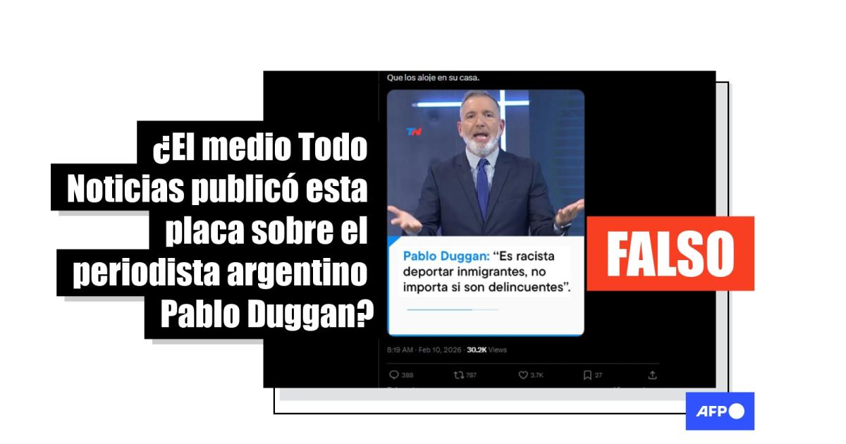 El periodista Pablo Duggan criticó el 9 de febrero de 2026 un control migratorio del Ministerio de Seguridad de Argentina, al que acusó de “racista”. Desde entonces, casi 1.000 usuarios de redes sociales comparten una supuesta placa del medio Todo Noticias (TN) que informa que Duggan dijo que “es racista deportar inmigrantes, no importa si son delincuentes”. Sin embargo, la imagen tiene inconsistencias gráficas respecto a los diseños de TN y fue creada por un cuenta satírica en X. Además, no hay registros de que el periodista haya dicho esa frase.
