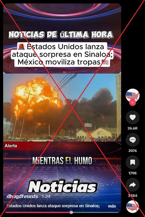 El presidente estadounidense, Donald Trump, ha dicho en múltiples ocasiones que atacará los cárteles de la droga en territorio mexicano. Desde el 28 de enero de 2026, circula en redes sociales una serie de imágenes de una explosión, lanzamisiles y barcos de guerra como un supuesto ataque de Estados Unidos en Sinaloa, uno de los estados mexicanos más afectados por la violencia. Pero el contenido, compartido 4.000 veces, muestra el estallido de una aeronave en Kentucky en 2025 y una prueba de lanzamiento de misiles hecha por la Marina estadounidense en 2018.