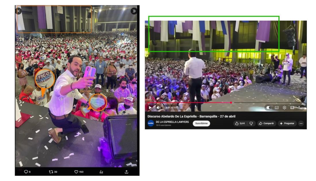 En la secuencia se puede observar que el auditorio del evento coincide con el recinto de la imagen que circula en redes. También se observa que los asistentes usan camisetas o gorras con el eslogan “Fico presidente”.