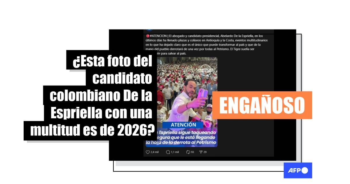 El abogado colombiano Abelardo de la Espriella es uno de los favoritos a las elecciones a la Presidencia del 31 de mayo de 2026. Desde febrero, se ha compartido en redes sociales una imagen en la que se observa al aspirante mientras se toma una selfi con una multitud, y usuarios indican que el candidato “ha llenado plazas y coliseos” en “los últimos días”. Sin embargo, la foto, compartida cientos de veces, fue tomada en 2022, durante un evento político en Barranquilla del entonces candidato Federico Gutiérrez.