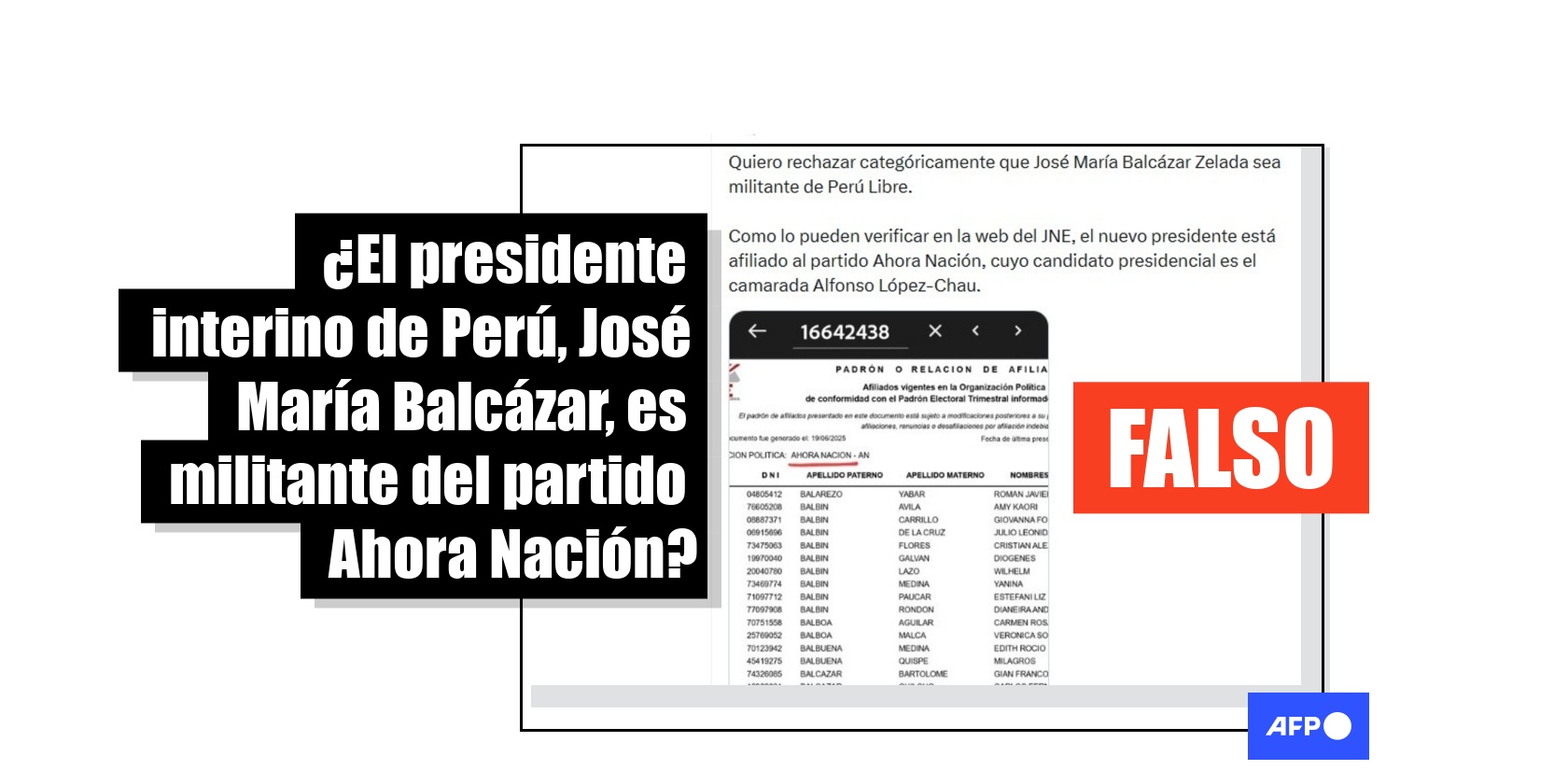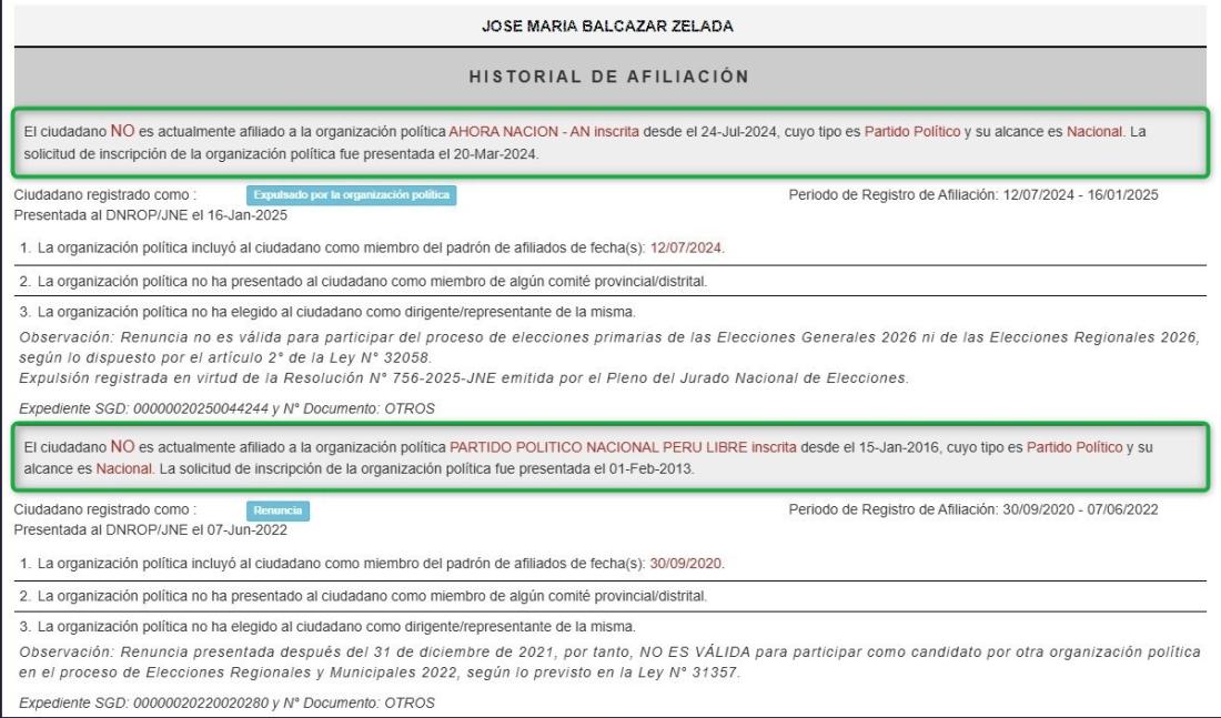 Esto también consta en el Registro de Organizaciones Políticas (ROP) del JNE, que descarta que Balcázar sea actual afiliado de Ahora Nación. Lo mismo se explica para Perú Libre.
