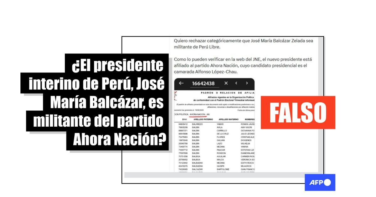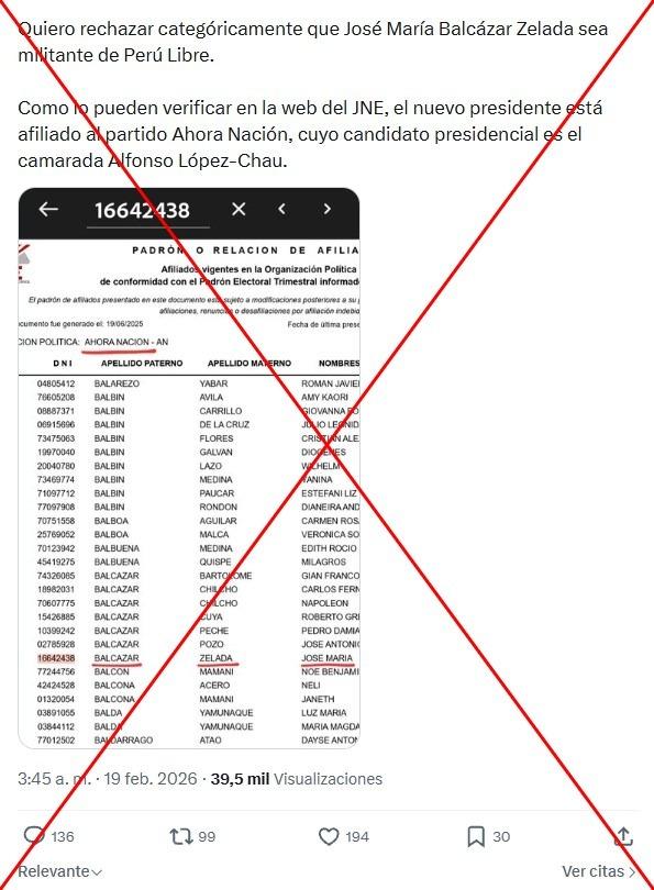El parlamentario José María Balcázar asumió la Presidencia interina de Perú luego de que el Congreso destituyera a su antecesor, José Jerí, el 17 de febrero de 2026. Tras este hecho, desde el 19 de febrero ha sido compartida más de 100 veces en redes sociales la afirmación de que Balcázar estaba afiliado al partido Ahora Nación. Sin embargo, según información oficial del Jurado Nacional de Elecciones, Balcázar fue expulsado de la agrupación política en enero de 2025 y, a la fecha, no cuenta con afiliación política.