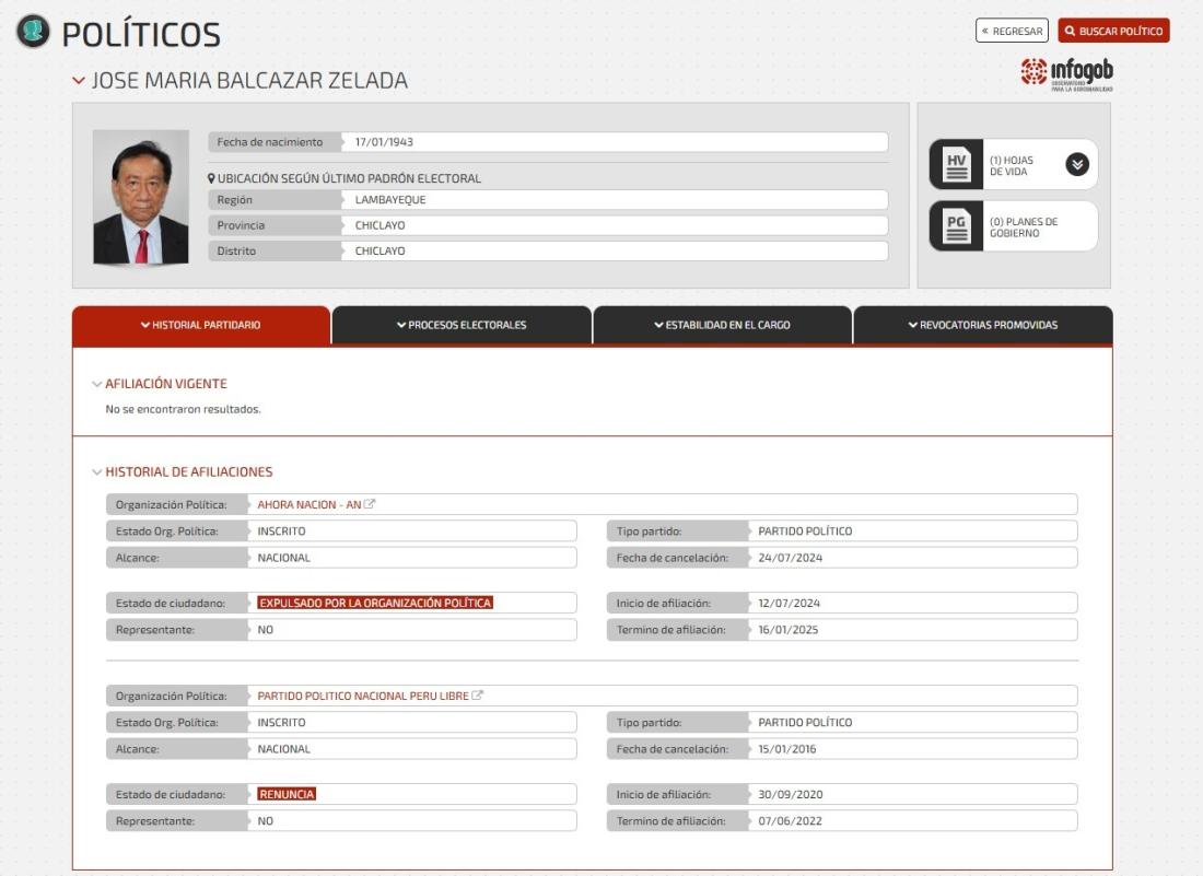 En la plataforma digital Infogob del Jurado Nacional de Elecciones (JNE), que centraliza la información de autoridades y partidos políticos, puede localizarse el historial de afiliaciones políticas de Balcázar.