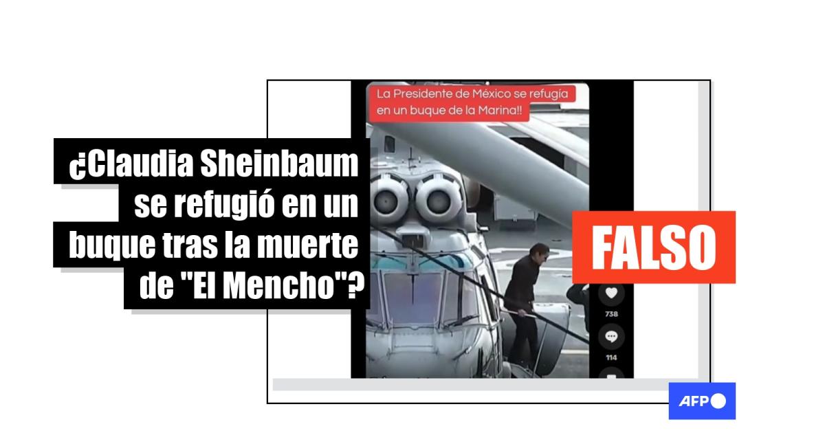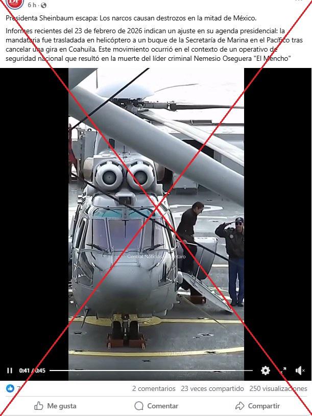 Las Fuerzas Armadas mexicanas abatieron a Nemesio “El Mencho” Oseguera, líder del poderoso Cartel Jalisco Nueva Generación (CJNG), durante un operativo en Jalisco, el 22 de febrero de 2026, lo que provocó una ola de violencia y pánico en varias regiones. Desde entonces, un video de la presidenta Claudia Sheinbuam supuestamente refugiándose en un buque de la Marina tras la muerte del delincuente ha sido compartido más de 5.500 veces en redes sociales. Sin embargo, la secuencia fue tomada tres semanas antes y muestra a la mandataria aterrizando en Sonora para inaugurar un museo subacuático.