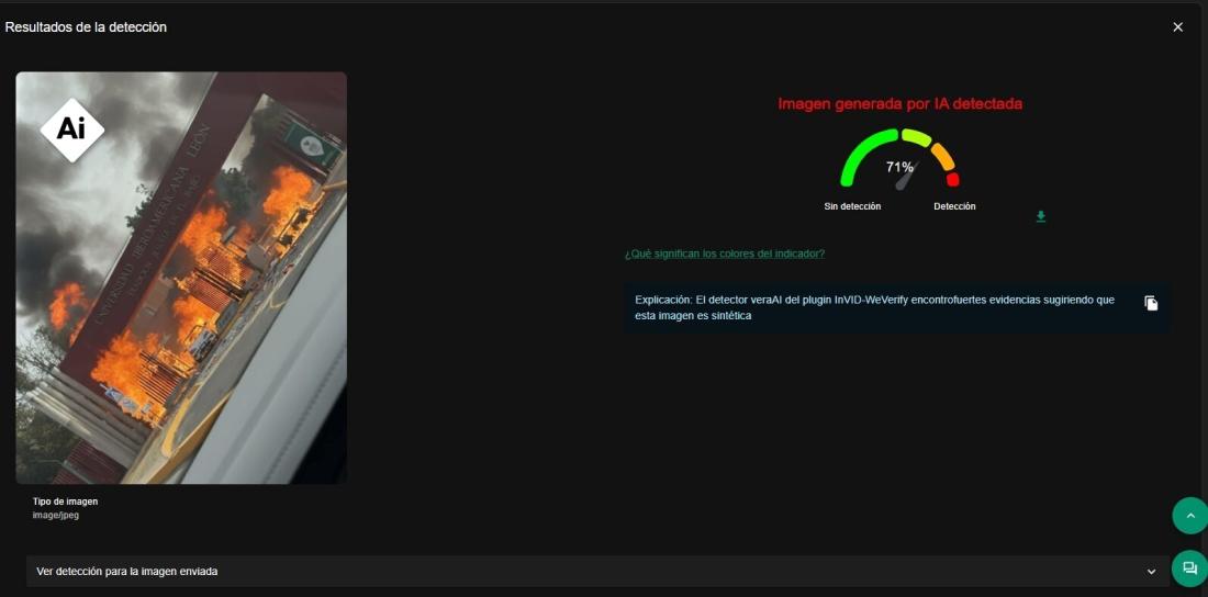 Otra evaluación con el detector de imágenes sintéticas de InVID-WeVerify mostró un 71% de probabilidades de haber sido creada con IA.