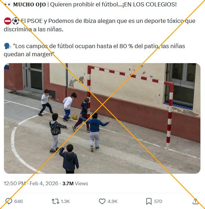 El partido Unidas Podemos presentó a fines de enero de 2026 mociones para transformar los patios de los colegios de dos municipios de Ibiza en “refugios climáticos e inclusivos”. Tras el anuncio, usuarios en redes sociales aseguraron que la agrupación habría planteado la prohibición del fútbol en los centros educativos, en mensajes compartidos más de 5.400 veces. Pero la propuesta, remitida a AFP Factual, no recoge la prohibición de practicar este deporte, sino la redistribución del espacio de los patios de recreo.
