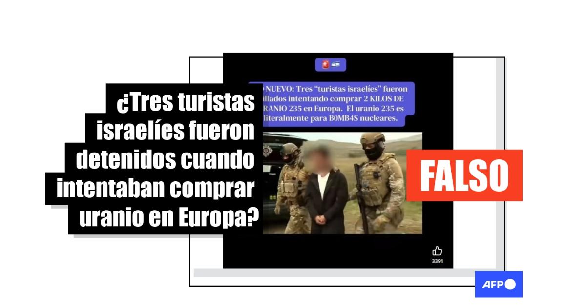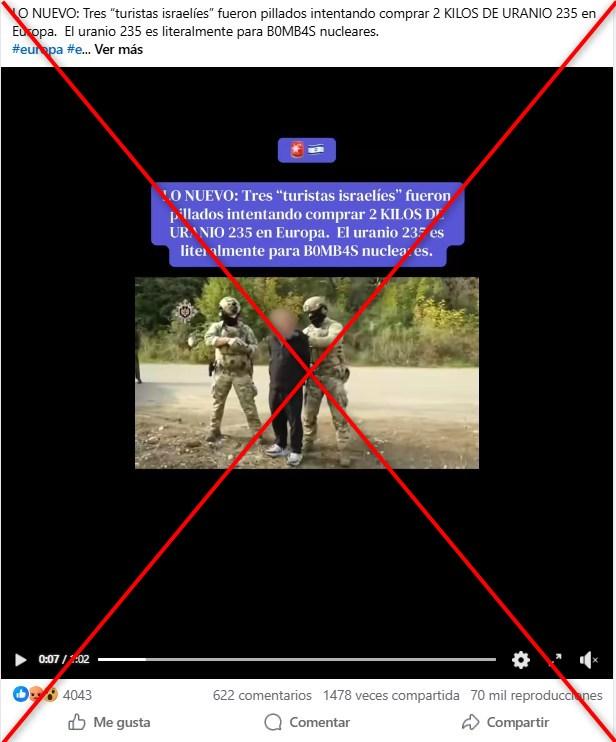 “LO NUEVO: Tres ‘turistas israelíes’ fueron pillados intentando comprar 2 KILOS DE URANIO 235 en Europa. El uranio 235 es literalmente para B0MB4S nucleares”, se lee en publicaciones de Facebook (1, 2), Instagram y X que difunden un video en el que se ve a agentes de seguridad deteniendo a un grupo de personas.
