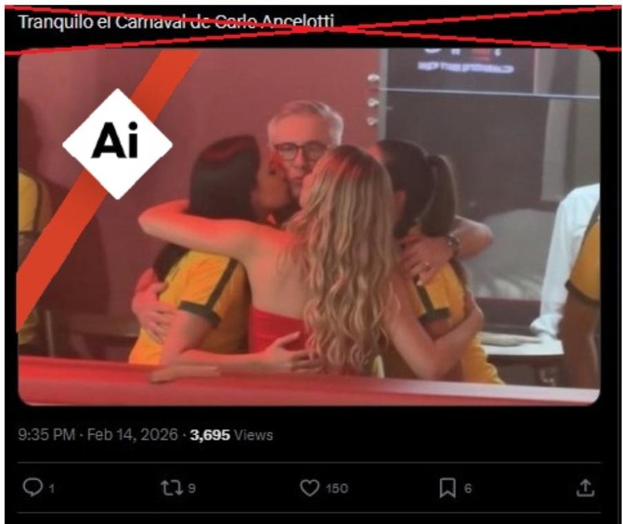 El entrenador de la selección brasileña, Carlo Ancelotti, fue grabado el 13 de febrero de 2026 en un palco durante el Carnaval de la ciudad brasileña de Salvador. Desde entonces, más de 2.000 usuarios de redes sociales replicaron una fotografía que muestra al estratega italiano besando a tres mujeres. Sin embargo, el contenido fue alterado con inteligencia artificial. En las imágenes originales, Ancelotti estaba solo.