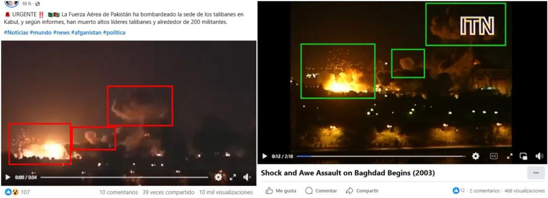 El 27 de febrero de 2026, Pakistán declaró la “guerra abierta” a Afganistán y bombardeó grandes ciudades del país, incluida Kabul. Usuarios en redes sociales difundieron vídeos del suceso, entre ellos uno que mostraría un ataque a “la sede de los talibanes” en la capital de Afganistán, compartido más de 340 veces. Sin embargo, el metraje corresponde al inicio de la invasión de Estados Unidos a Irak en 2003.