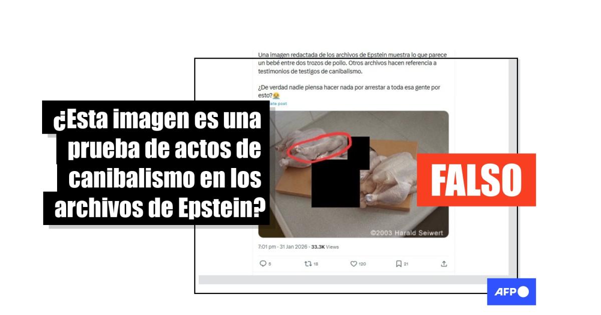 El Departamento de Justicia de Estados Unidos (DoJ) publicó más de tres millones de documentos relacionados con el delincuente sexual Jeffrey Epstein, el 30 de enero de 2026. Desde entonces, una imagen de un supuesto bebé entre trozos de pollo, publicada por el DoJ, fue compartida más de 1.500 veces junto a la afirmación de que prueban actos de canibalismo por parte del fallecido empresario. Sin embargo, se trata de un montaje creado por un fotógrafo para un concurso de una asociación vegetariana.