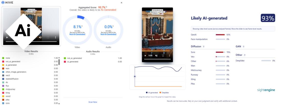 El análisis con los detectores Hive Moderation y Sight Engine indicó más de 90% de probabilidades de que el video haya sido generado con herramientas de inteligencia artificial.