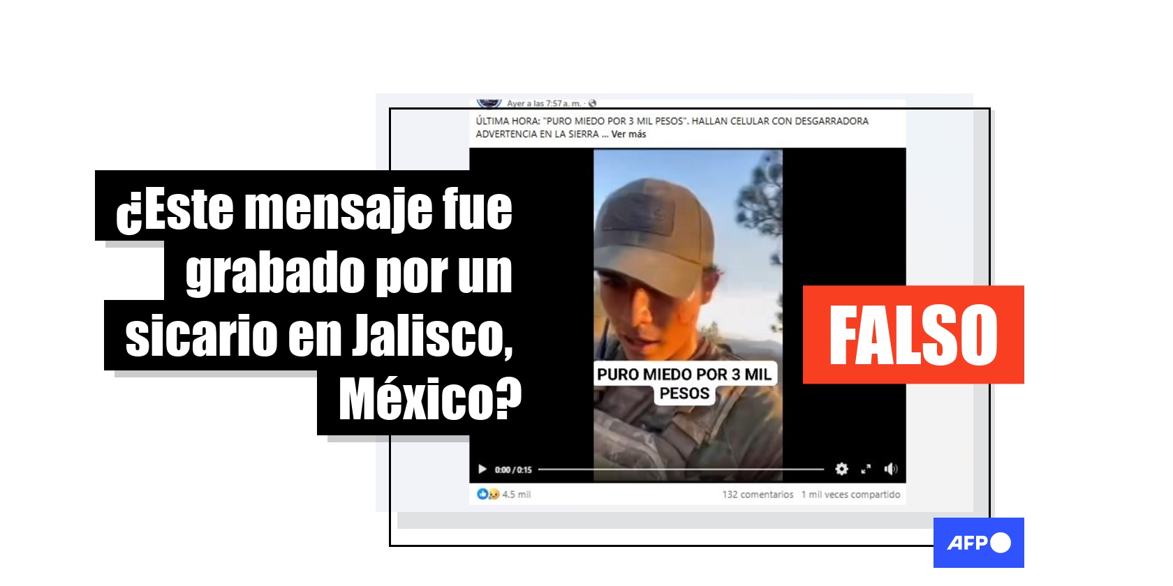 “ÚLTIMA HORA: ‘Puro miedo por 3 mil pesos’. Hallan celular con desgarradora advertencia en la sierra. Las imágenes son crudas y hablan por sí solas. En medio de la compleja situación que se vive en Guadalajara y sus alrededores, sale a la luz este escalofriante video”, señalan publicaciones en Facebook (1, 2), que incluyen un video de 15 segundos en el que un joven que está en un monte dice: “Mándale este video a tu hijo, carnal. Neta no te alucines, aquí andaba yo hoy. Mira cómo ando: No hay carros, no hay morras, puro miedo por 3.000 pesos, mejor estudia”.