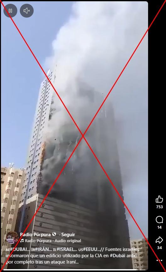 “Fuentes israelíes informaron que un edificio utilizado por la CIA en #Dubái ardió por completo tras un ataque Iraní”, señalan publicaciones en Facebook (1, 2) junto a un video de 10 segundos en el que se ve una columna de humo desprenderse de un rascacielos. El contenido también circula en Instagram (1, 2), X y YouTube.