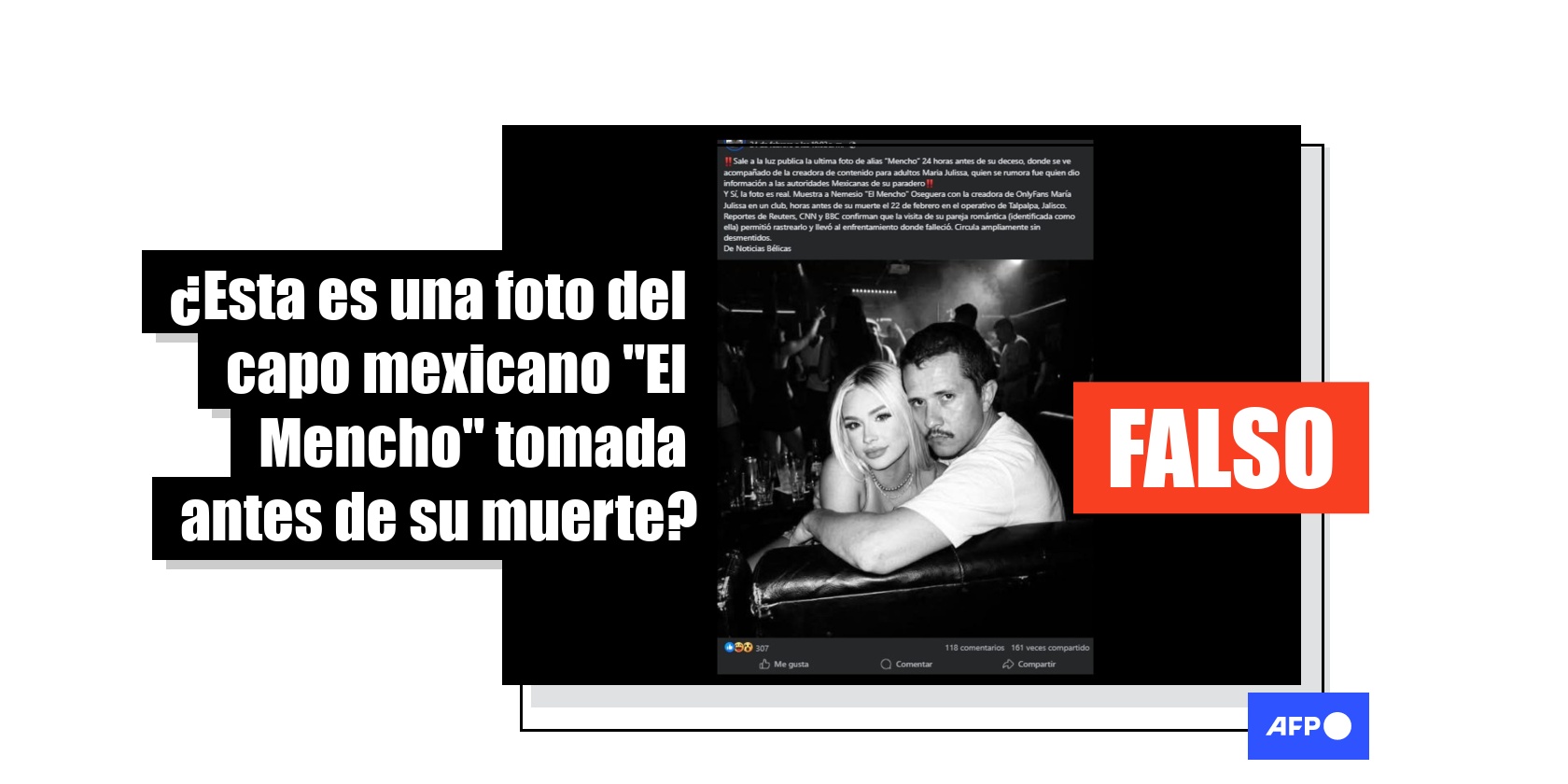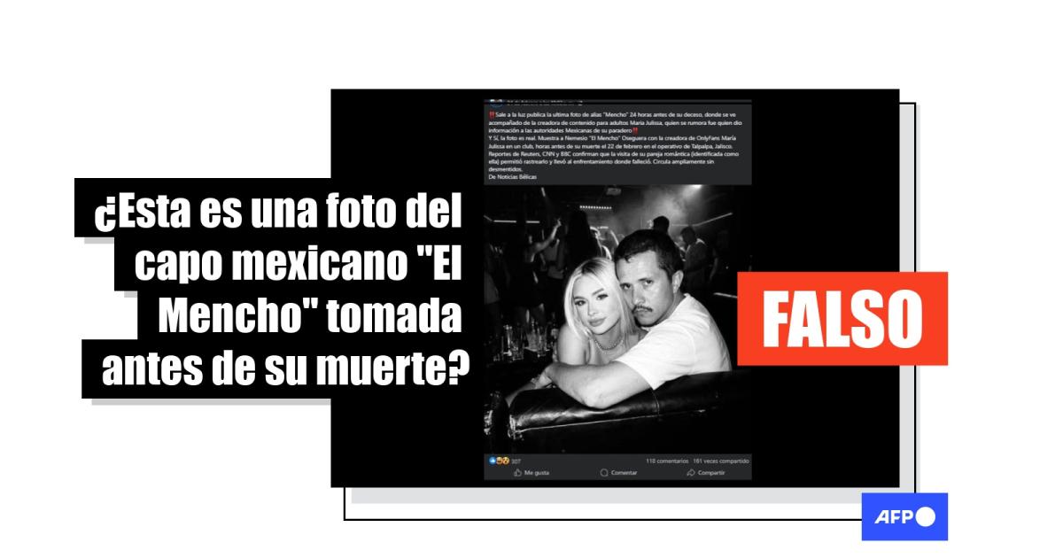 El narcotraficante Nemesio Oseguera Cervantes, conocido como “El Mencho”, fue abatido por el ejército mexicano durante un operativo el 22 de febrero de 2026. Entre la desinformación difundida tras su muerte, una imagen del capo junto a la influencer mexicana María Julissa ha sido compartida más de 2.000 veces en redes sociales. Las entradas afirman que se trata de la última foto que se tomó “24 horas antes de su deceso”. En realidad, la imagen fue generada con inteligencia artificial y está basada en una foto antigua.