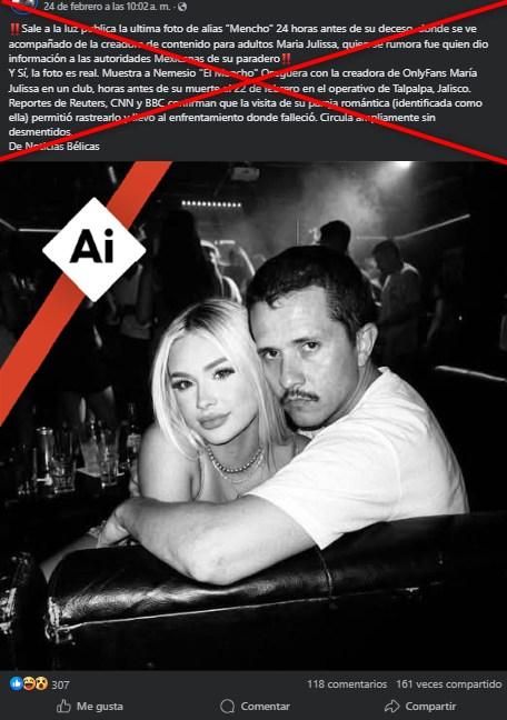 “Sale a la luz publica la ultima foto de alias “Mencho” 24 horas antes de su deceso, donde se ve acompañado de la creadora de contenido para adultos Maria Julissa, quien se rumora fue quien dio información a las autoridades Mexicanas de su paradero. Y Sí, la foto es real”, afirma una publicación en Facebook.