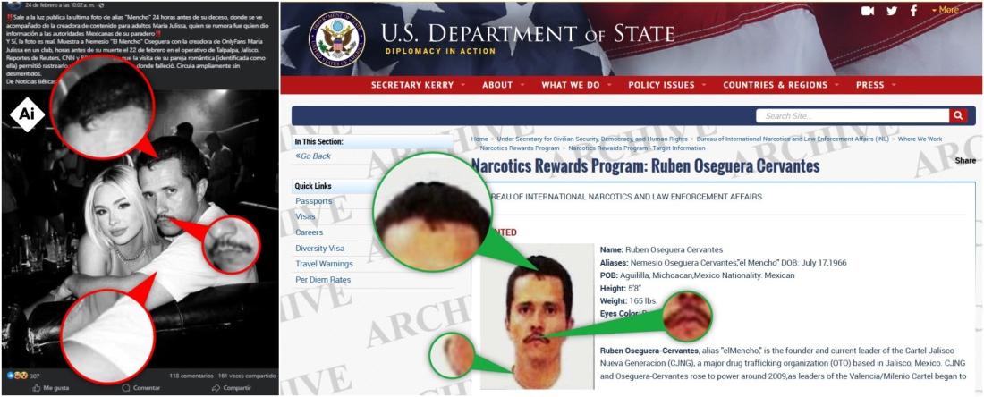 Una comparación con la imagen viral muestra coincidencias en el rostro joven y afilado, el bigote delgado, el peinado y la camiseta blanca. Ese semblante juvenil no coincide con los 59 años que tenía el capo antes de morir, de acuerdo con el Departamento de Estado estadounidense.