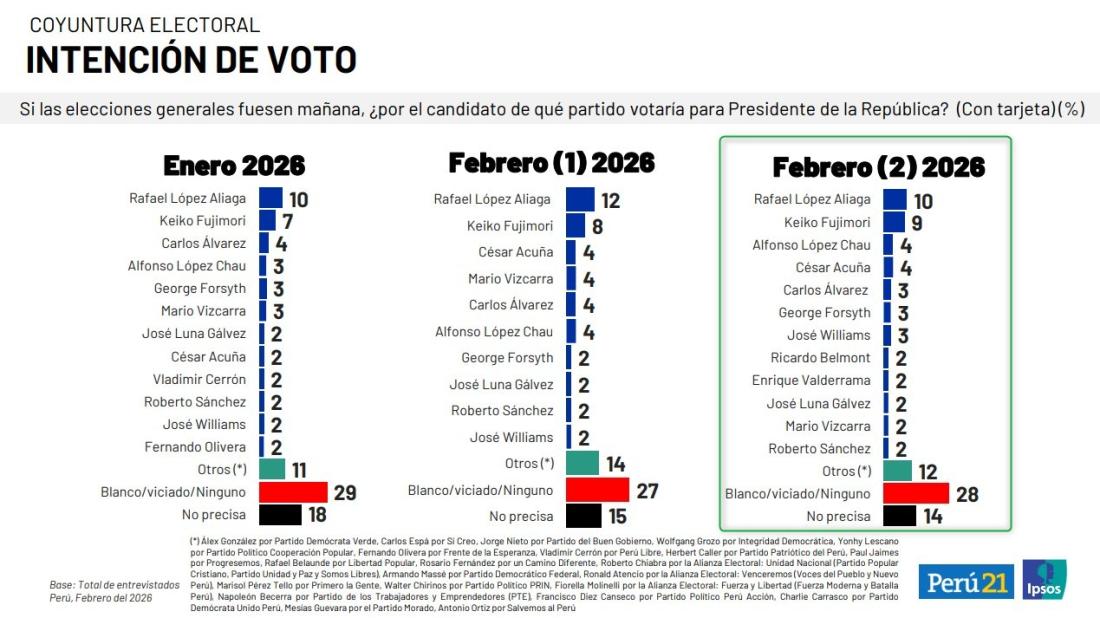 El último estudio de Ipsos sobre “Intención de voto en primera vuelta” para la Presidencia fue difundido en el diario Perú21 el 26 de febrero de 2026 (1, 2, 3). Se trata del segundo informe divulgado y realizado en este mes por la empresa.