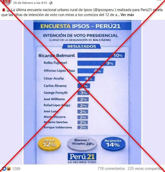 “Encuesta Ipsos - Perú21. Intención de voto presidencial”, se lee en el encabezado de una gráfica de tono azul, que indica que el presunto estudio se dio tras la elección del nuevo presidente interino José María Balcazar, el 18 de febrero.