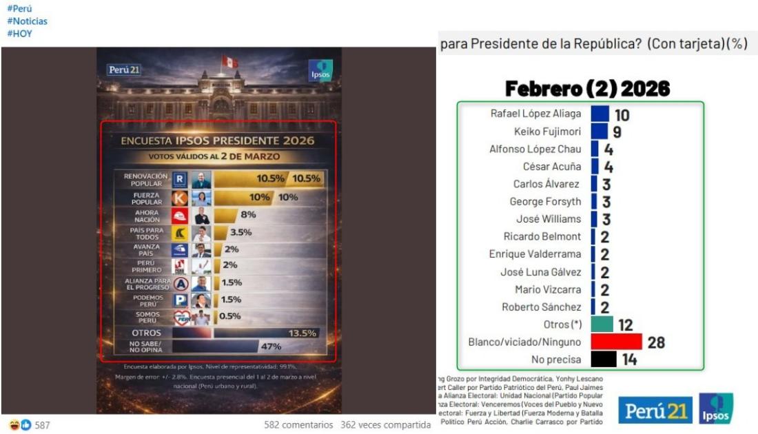 Entradas similares fueron difundidas en Facebook (1, 2, 3) junto a mensajes como: “Última encuesta publicada al 2 de marzo - presidencial Perú 2026” y “TRIPLE EMPATE EN EL PRIMER LUGAR”.