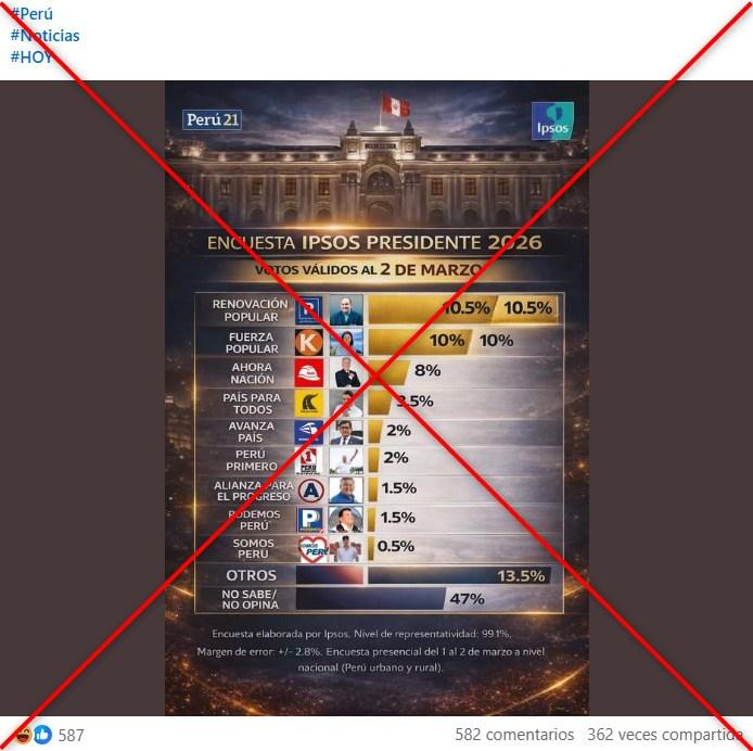 Una revisión de las redes sociales (1, 2) y la página web de Ipsos Perú hasta el 6 de marzo de 2026 no arrojó ninguna encuesta de intención de voto presidencial de este mes con el resultado expuesto por la placa viral.