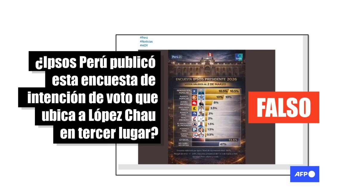 Es falsa una encuesta adjudicada a Ipsos Perú que favorece al candidato López Chau con un 8%