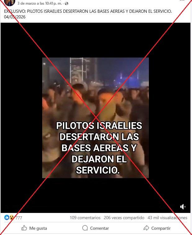 El ejército de Israel ha continuado sus ataques contra Irán, en una guerra que inició el 28 de febrero con los bombardeos israeloestadounidenses contra la república islámica y que se ha expandido a todo Medio Oriente. En ese contexto, circula en redes sociales el video de supuestos pilotos israelíes “abandonando sus posiciones” porque no quieren participar en la guerra. Pero la grabación, compartida más de 4.000 veces, muestra a policías israelíes desplegados en Tel Aviv en 2024 para contener una protesta contra el gobierno de Benjamín Netanyahu.
