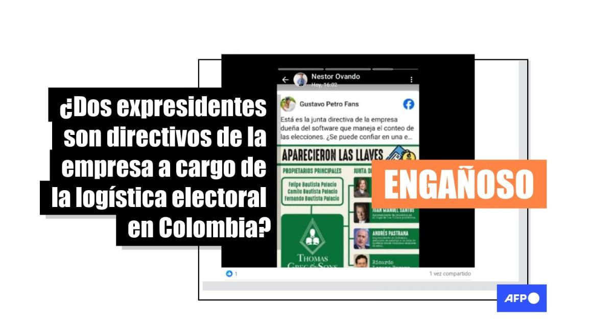 “Esta es la junta directiva de la empresa dueña del software que maneja el conteo de las elecciones”, dice una publicación de Facebook junto a un diagrama de la multinacional Thomas Greg & Sons, en la que figuran los expresidentes Santos (2010-2018) y Pastrana (1998-2002).