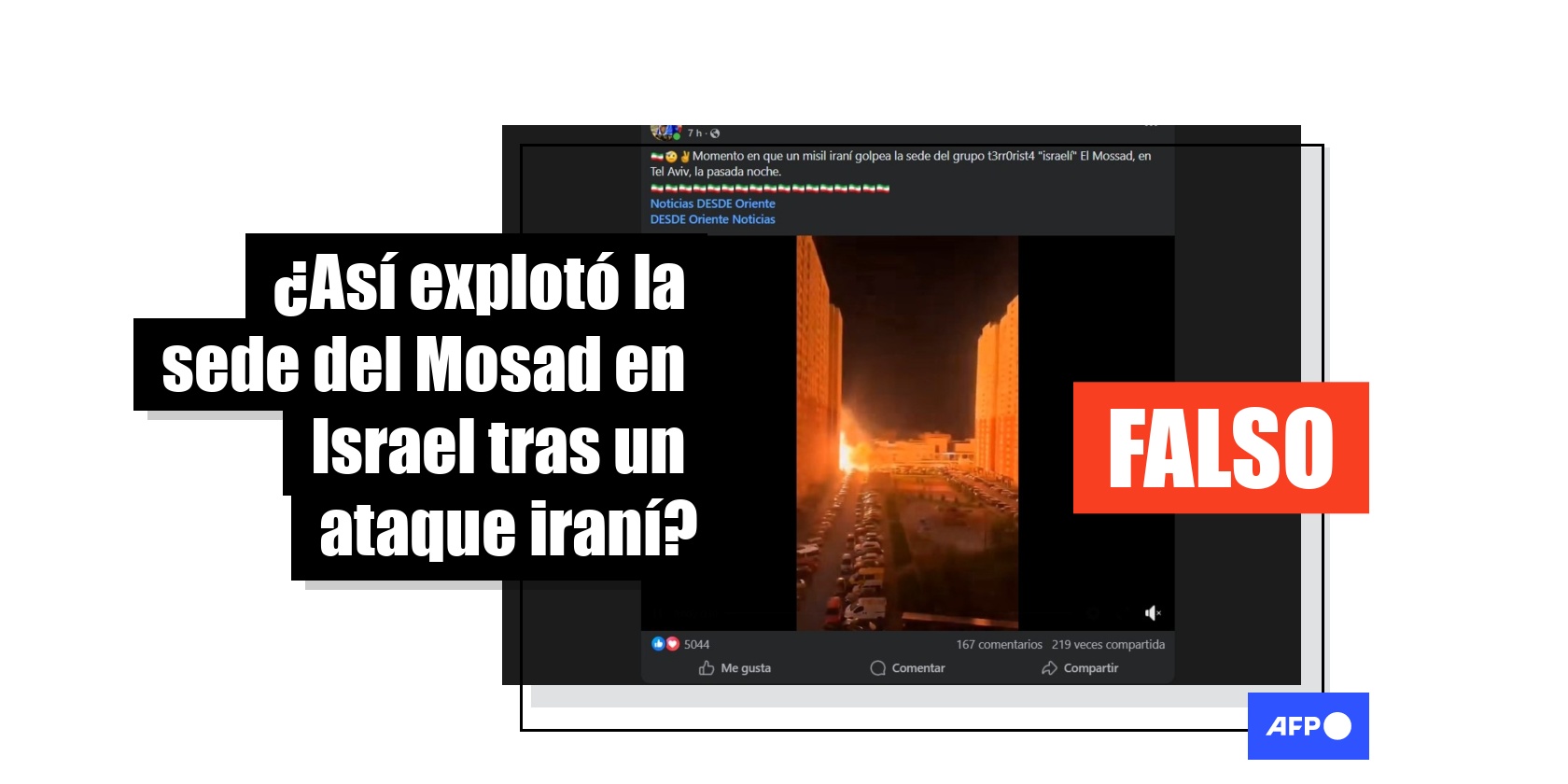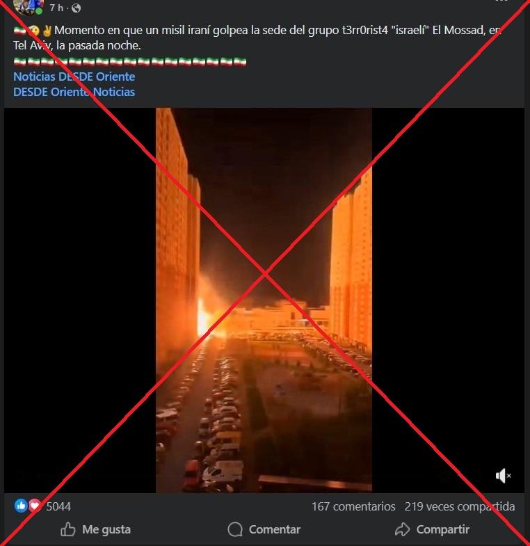 “Momento en que un misil iraní golpea la sede del grupo t3rr0rist4 ‘israelí’ El Mossad, en Tel Aviv, la pasada noche”, escribe un usuario en Facebook junto a un video que muestra una gran explosión delante de un complejo de edificios.
