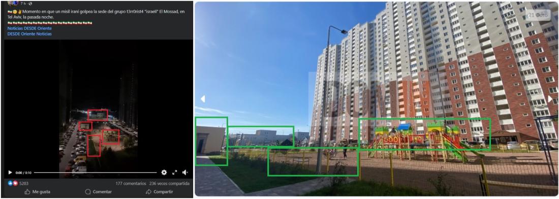 Una pesquisa en Google con los términos en ucraniano “Navigator” y “apartamentos” ofreció como resultado el sitio web de una inmobiliaria ucraniana llamada Domin. Allí se ve una fotografía del complejo con algunos elementos que también aparecen en el video viral: una plaza con juegos infantiles rodeada por una valla, una edificación amarilla a la izquierda y en el fondo un edificio gris.
