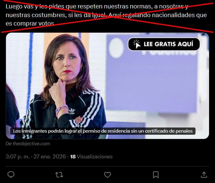 The Objective pidió disculpas más tarde por haber difundido por “error” que “los inmigrantes podrán lograr la nacionalidad sin un certificado de antecedentes penales”, y afirmó que se refería al “permiso de residencia” extraordinario propuesto por el Ejecutivo. Después cambió el titular.