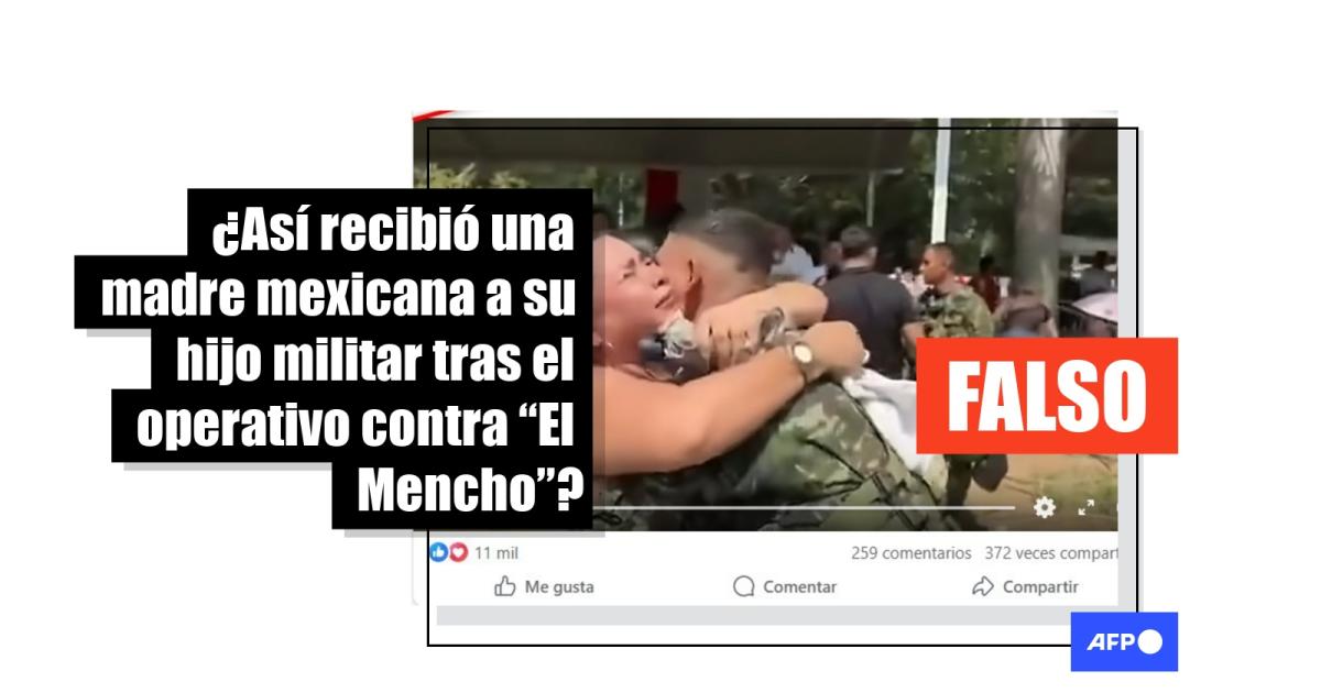 El narcotraficante Nemesio Oseguera Cervantes, conocido como “El Mencho”, fue abatido por el ejército mexicano durante un operativo el 22 de febrero de 2026. Tras el enfrentamiento, usuarios en redes sociales han difundido más de 2.000 veces un video que muestra a una mujer que abraza a un hombre vestido de militar, junto con la afirmación de que se trata de un elemento del ejército que participó en esa ofensiva. Pero es falso. La secuencia muestra el recibimiento de militares en Colombia durante Año Nuevo.