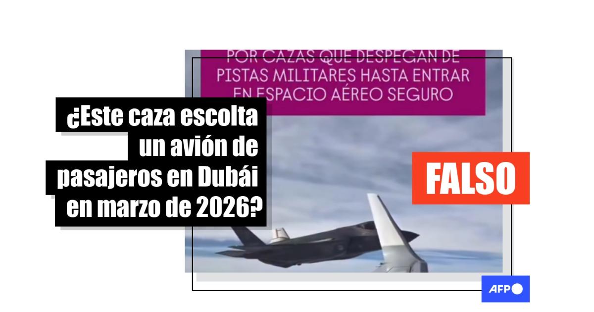 La guerra de Oriente Medio, iniciada el 28 de febrero de 2026 tras ataques israelo-estadounidenses a Irán, obligó a suspender temporalmente las operaciones en el aeropuerto de Dubái el 7 de marzo. Antes de este suceso, el vídeo de un caza negro volando junto a un avión comercial para supuestamente escoltarlo hasta un espacio aéreo seguro en esa ciudad emiratí fue compartido en redes sociales más de 50 veces. Pero la secuencia muestra a la Real Fuerza Aérea neerlandesa recibiendo al equipo nacional tras los Juegos Olímpicos de Invierno de 2026.