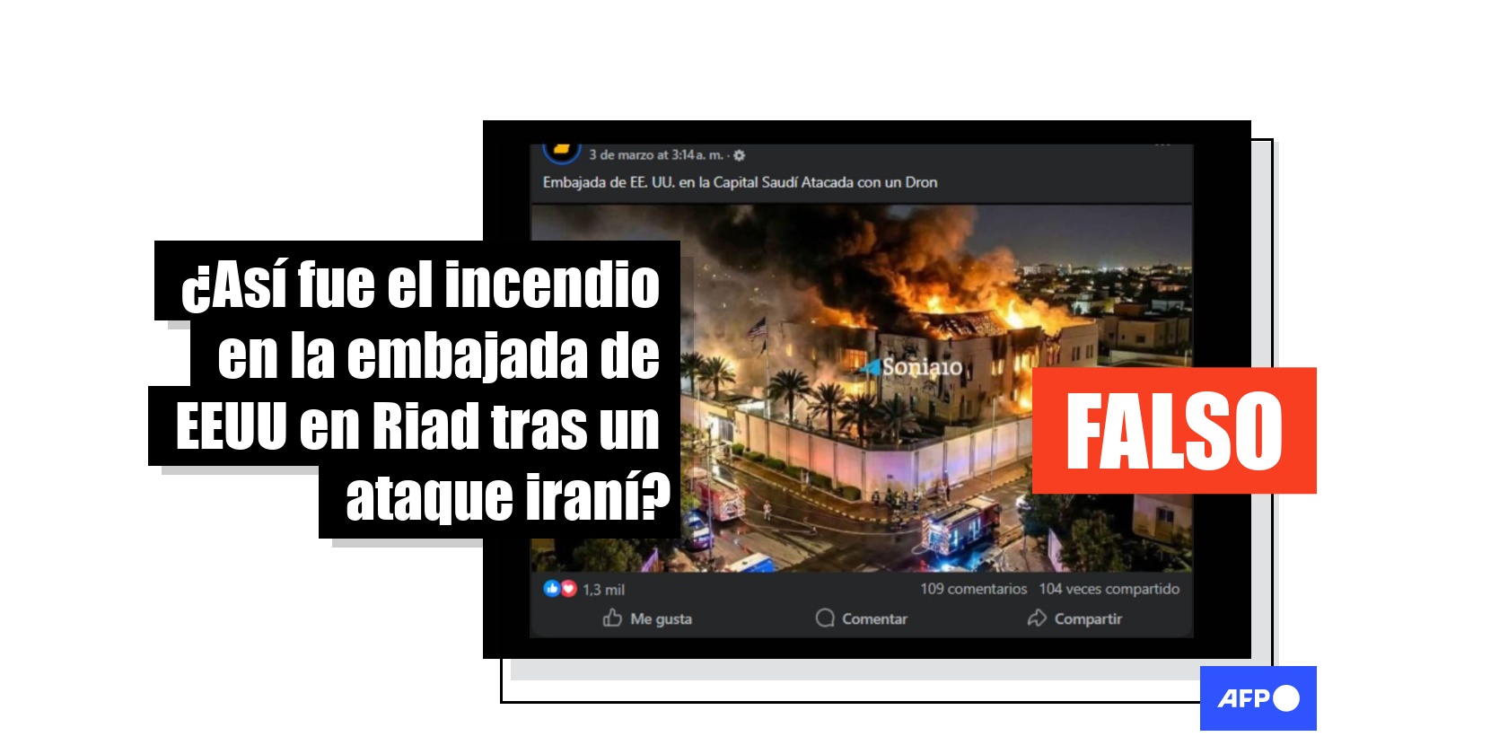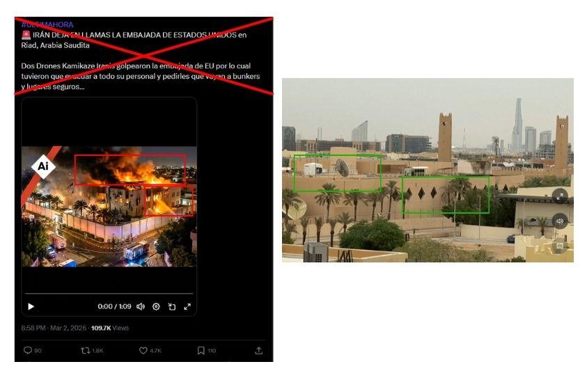 La embajada de Estados Unidos en Riad, capital de Arabia Saudita, fue atacada por drones el 3 de marzo de 2026, en medio de una ofensiva iraní en represalia a la acción militar conjunta lanzada por Israel y Washington a finales de febrero. Sin embargo, una foto compartida más de 1.800 veces en redes sociales, que muestra el edificio en llamas, fue creada con inteligencia artificial (IA). Los registros publicados en la prensa muestran daños considerablemente menores en la sede diplomática estadounidense.