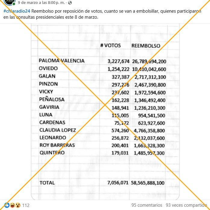 “Estos son los dineros por reposición de votos que le corresponde a cada uno de los candidatos que participaron ayer en la consulta, se pagan con los impuestos de nosotros los colombianos.* Ese es el negocio socio!!”, señala un mensaje en Facebook.
