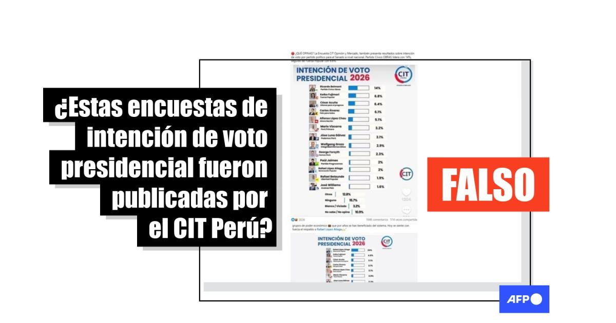 La carrera electoral en Perú, rumbo a los comicios del 12 de abril de 2026, cuenta con 36 aspirantes a la Presidencia. A poco más de un mes, en redes sociales circulan dos encuestas de intención de voto atribuidas a CIT Perú que fueron modificadas. Una pone primero a Ricardo Belmont, del Partido Cívico Obras, con 14%; la otra, a Rafael López Aliaga, de Renovación Popular, con 24%. Los montajes se compartieron 1.000 veces. En realidad, el estudio del CIT Perú previo a las publicaciones muestra a López Aliaga líder con 14% y a Belmont disputando el décimo lugar con 2%.
