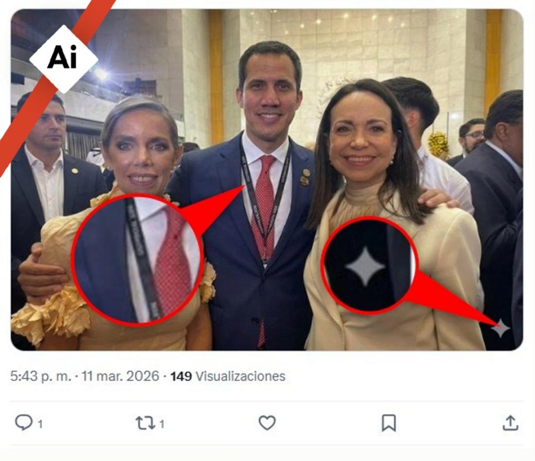 En la esquina inferior derecha de la imagen viral se observa la marca de agua de Gemini, el chatbot de inteligencia artificial de Google. En la foto se observa que las letras en la supuesta escarpela de Guaidó se fusionan, una inconsistencia usual en contenidos generados artificialmente.