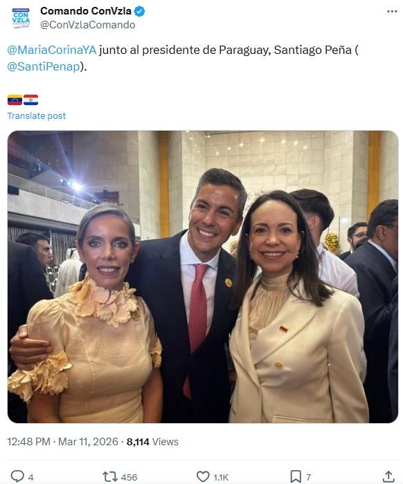 Una búsqueda inversa mediante Google Lens permitió localizar la foto original, divulgada por el equipo de comunicación de Machado, el día de la juramentación. En ella, la dirigente posa con el presidente de Paraguay, Santiago Peña, y la primera dama, Leticia Ocampos.
