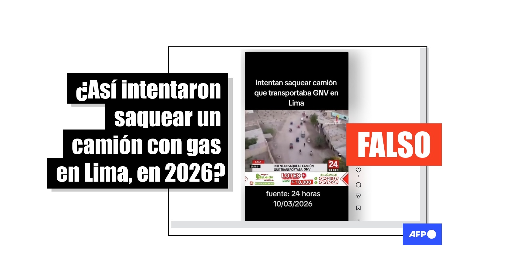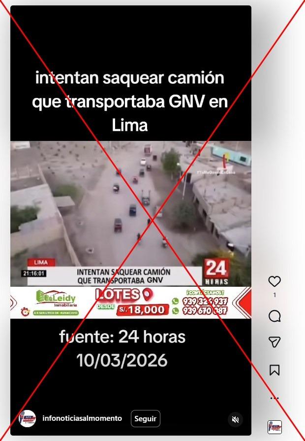 “Intentan saquear camión que transportaba GNV en Lima”, se lee junto a un video compartido en Instagram, TikTok, Facebook y X. También aparece la fecha “10/03/2026”.