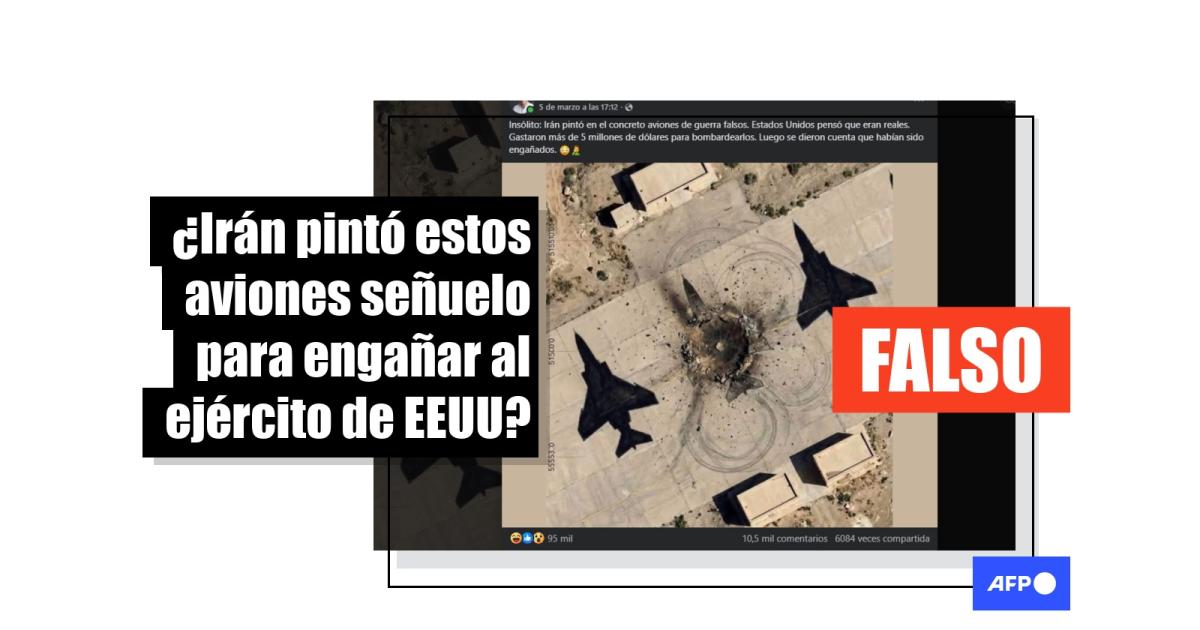 “Insólito: Irán pintó en el concreto aviones de guerra falsos. Estados Unidos pensó que eran reales. Gastaron más de 5 millones de dólares para bombardearlos. Luego se dieron cuenta que habían sido engañados”, escribe un usuario en Facebook junto a una imagen que muestra un cráter entre dos siluetas aviones.