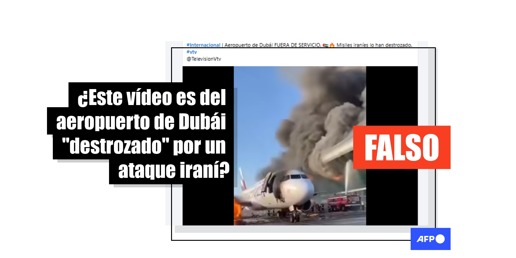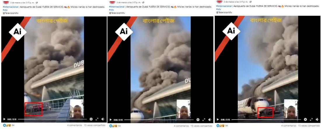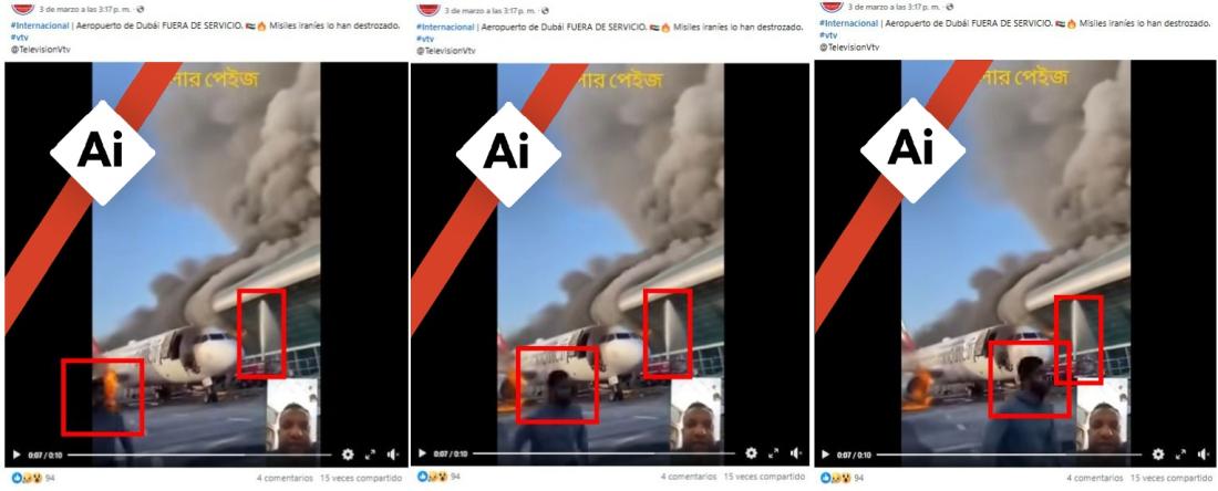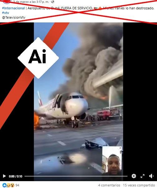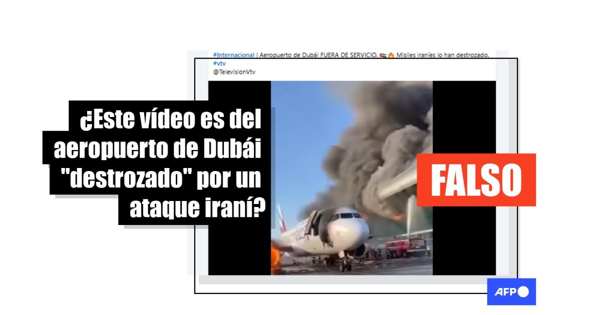 El 7 de marzo de 2026, el aeropuerto de Dubái suspendió su actividad por algunas horas después de interceptar proyectiles iraníes, en el marco de la guerra en Oriente Medio. Desde el comienzo del conflicto, usuarios en redes sociales difunden vídeos al respecto, como el que mostraría un avión y al aeropuerto emiratí, ambos en llamas, como resultado de un ataque. Pero la escena, compartida más de 600 veces, presenta indicios de generación digital, según expertos consultados por AFP Factual.