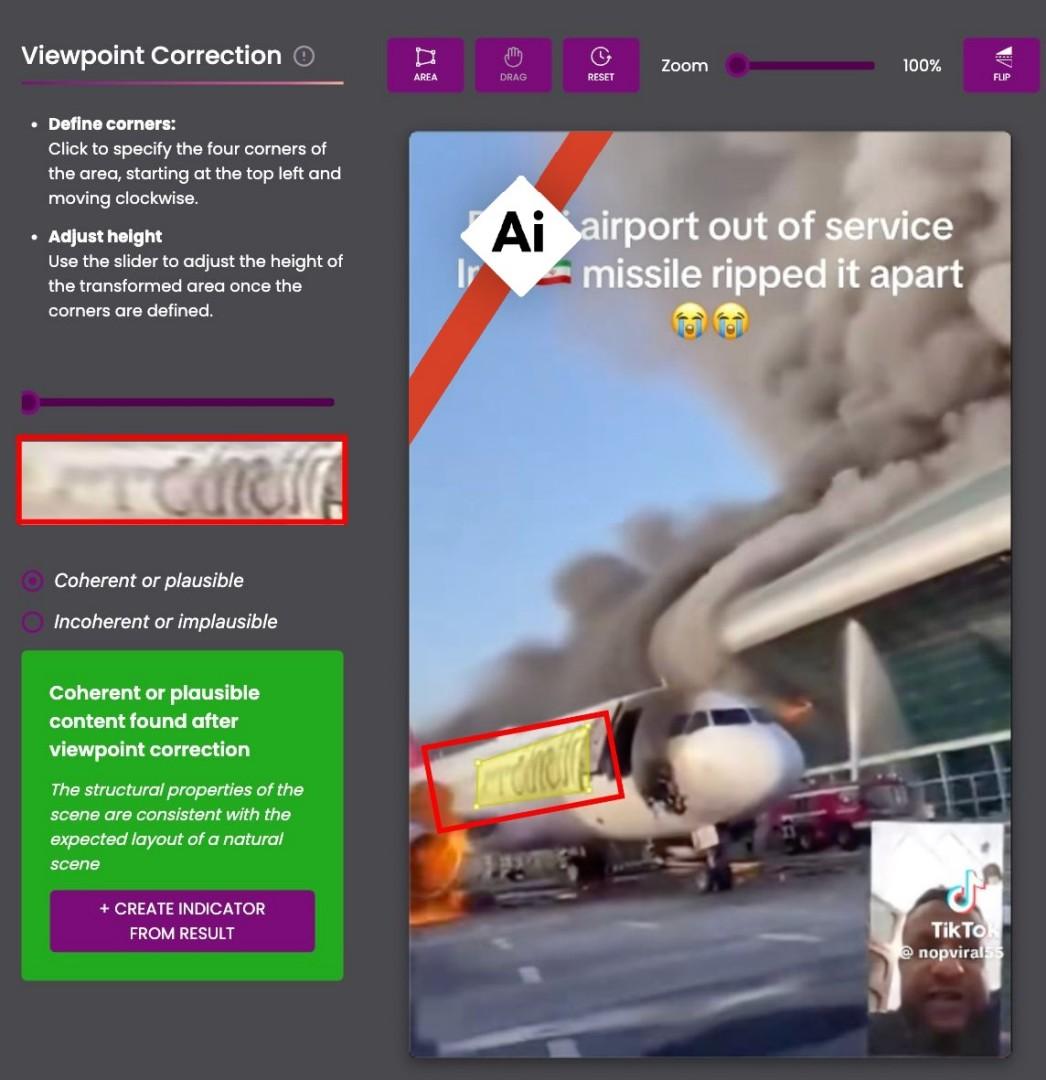 Además, pese a que la localización lateral de las letras y los colores rojo, verde, blanco y negro de la cola de la aeronave coincidirían con los diseños de la aerolínea Emirates, el rojo de la parte trasera del avión se extiende demasiado por la cola en el vídeo viral respecto a lo que en realidad abarcaría.