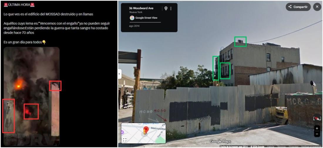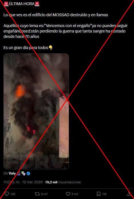 El 11 de marzo de 2026, el ejército iraní anunció que había atacado un centro de inteligencia militar israelí, la base naval de Haifa y un radar. A partir de esa fecha, usuarios en redes sociales compartieron más de 7.000 veces un vídeo de un edificio en llamas que, según afirmaban, corresponde a los efectos de esa ofensiva en Tel Aviv. Sin embargo, la grabación en realidad es de un incendio en un edificio residencial en Nueva York.