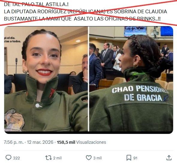 “DE TAL PALO TAL ASTILLA.! LA DIPUTADA RODRÍGUEZ (REPÚBLICANA) ES SOBRINA DE CLAUDIA BUSTAMANTE LA MAMI QUE ASALTO LAS OFICINAS DE BRINKS..!!”, dicen los usuarios en Facebook, Instagram, Threads, TikTok y X.