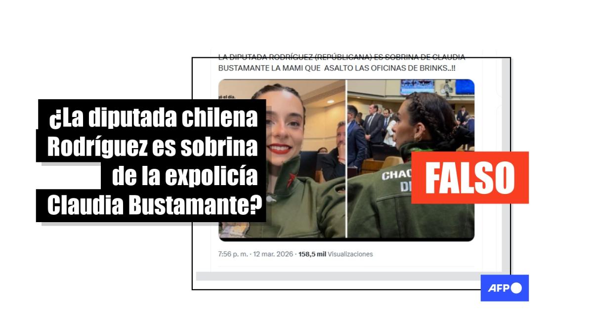 La Cámara de Diputados de Chile fue renovada el 11 de marzo de 2026 y durante la ceremonia de juramentación, la diputada Javiera Rodríguez vistió prendas similares al uniforme de la institución policial Carabineros. Desde entonces, se difunden en redes sociales fotografías de la diputada junto a la afirmación de que “es sobrina” de una excarabinera que participó en un robo millonario a una empresa de valores. El contenido se compartió más de 5.000 veces, pero el contenido es falso. AFP Factual comprobó que no hay relación familiar tras obtener acceso al certificado de nacimiento de la legisladora.