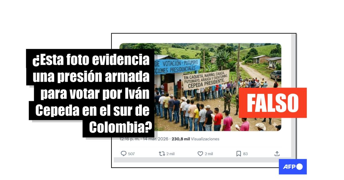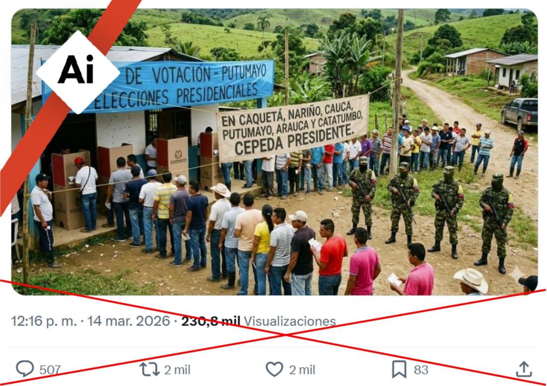 Tras las elecciones legislativas y consultas presidenciales del 8 de marzo de 2026 en Colombia, en redes sociales se difundió más de 2.000 veces una fotografía que mostraría un puesto de votación en una zona rural del país, custodiado por hombres armados y con letreros a favor del candidato presidencial oficialista Iván Cepeda. Los usuarios afirman que la escena muestra la presión de grupos guerrilleros a favor de su partido, Pacto Histórico. Pero la imagen fue generada con inteligencia artificial (IA).