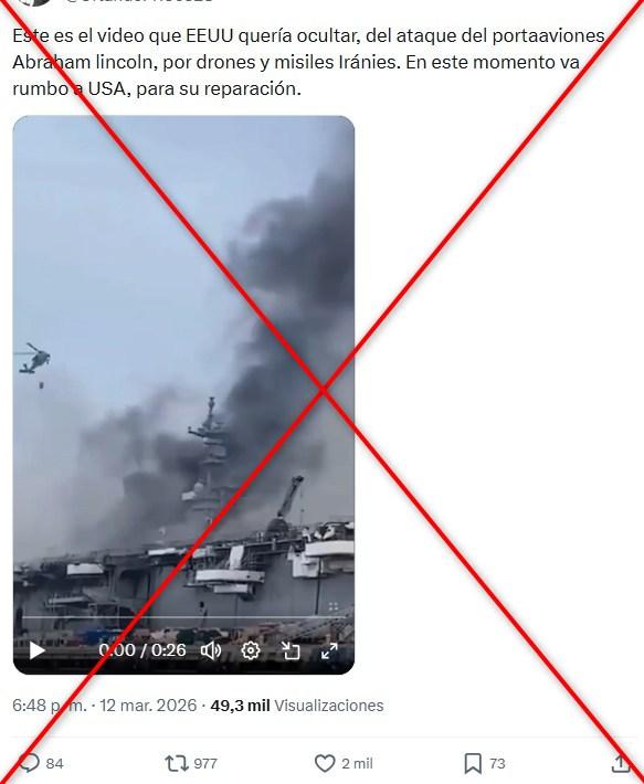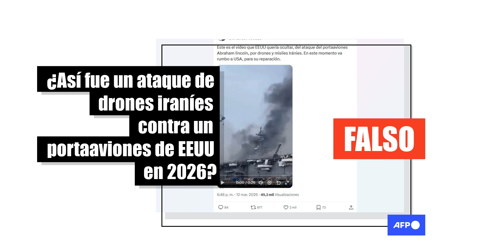El 5 de marzo de 2026, la televisión estatal iraní informó que el portaaviones USS Abraham Lincoln de Estados Unidos fue atacado por drones de los Guardianes de la Revolución Islámica (IRGC), hecho que negó el gobierno estadounidense. Desde entonces, usuarios en redes sociales han compartido más de 2.000 veces un video que supuestamente muestra un incendio en ese portaaviones. Pero la secuencia es de un incidente del portaaviones USS Bonhomme Richard, ocurrido en una base de la armada americana en California.